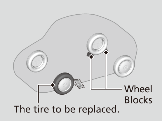 - Place a wheel block or rock in front and rear of the wheel diagonal to the flat tire.