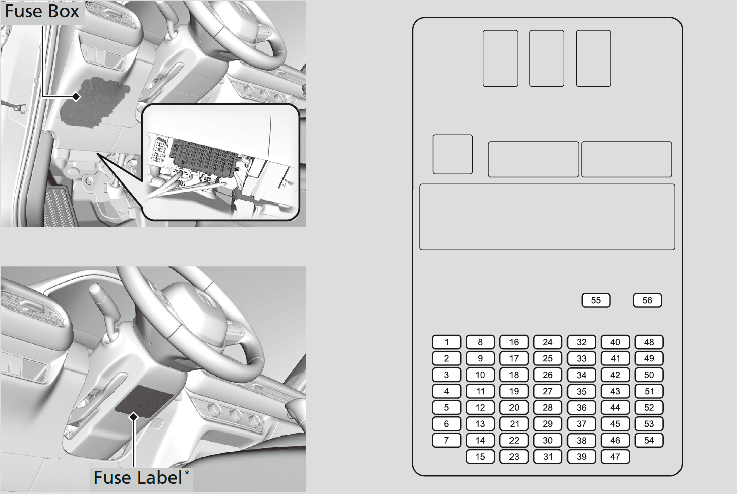 Fuse locations are shown on the label* under the steering column or the image below. Locate the fuse in question by the fuse number.