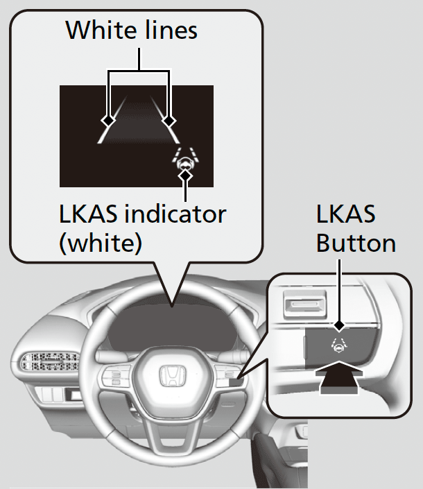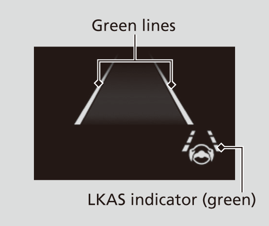 - The LKAS indicator changes from white to green, and white lines change to green once the system starts operating after detecting the left and right lane markings.