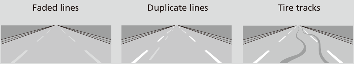 - When objects on the road (curb, guard rail, pylons, etc.) are recognized as white (or yellow) lines.