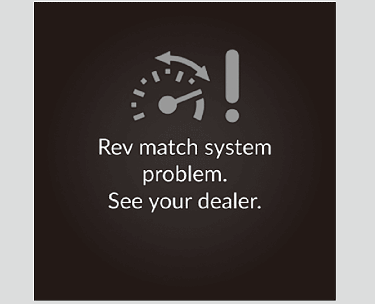 If you depress the accelerator pedal while changing gears, the system may give priority to inputs from the accelerator pedal depending on the amount of depression of the accelerator pedal.If the message below appears, there may be a problem with the system. The rev match system may not operate, but you can perform regular gear shifting.