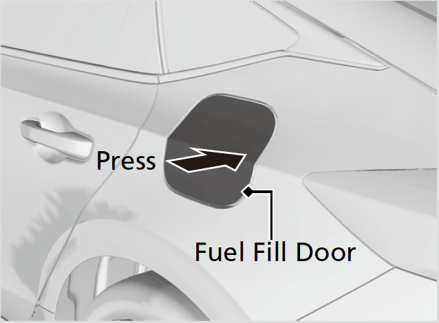 - Press and release the area indicated by the arrow to release the fuel fill door. You will hear a click and the lid will open slightly.