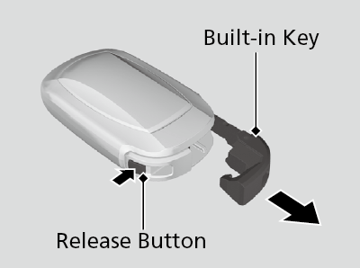 To remove the built-in key, push the release button and then pull out the key. To reinstall the built-in key, push the built-in key into the keyless remote until it clicks.