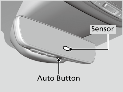 When you are driving after dark, the automatic dimming rearview mirror and power door mirror* reduces the glare from headlights behind you. Press the AUTO button to turn this function on and off. When activated, the AUTO indicator comes on.