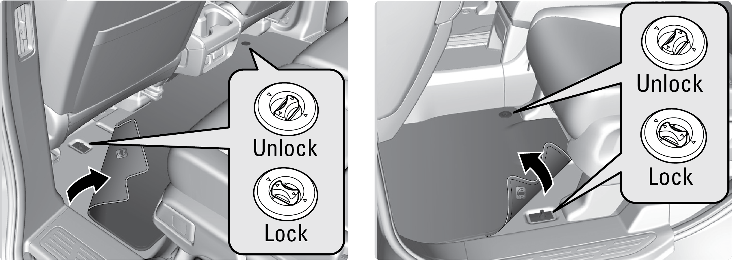 Position the front and rear seat floor mats properly and anchor them. If they are not properly positioned, the floor mats can interfere with the front seat functions.