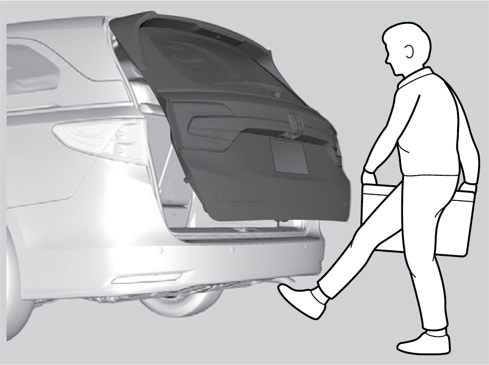 Use a forward and back kicking motion under the center of the rear bumper to open or close the power tailgate while carrying the smart entry remote. Some exterior lights flash twice and a beeper sounds once, then the tailgate begins to move.
