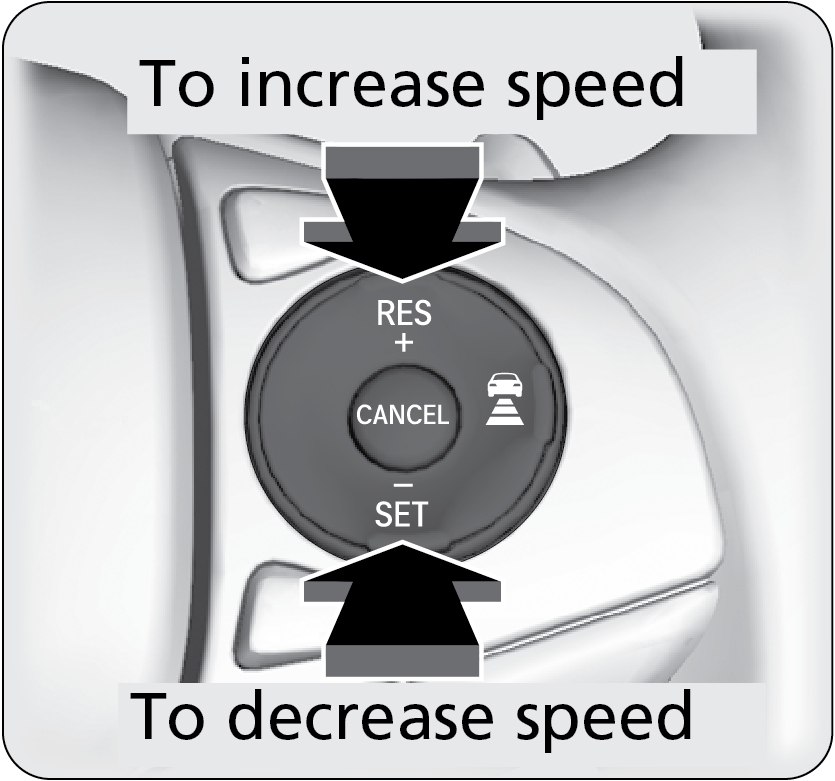 Press the RES/+ button to increase speed or the SET/- button to decrease speed. Each time you press the button, the vehicle speed is increased or decreased by about 1 mph (1.6 km/h). If you keep the button pressed, the vehicle speed increases or decreases by 5 mph or 5 km/h until you release it.