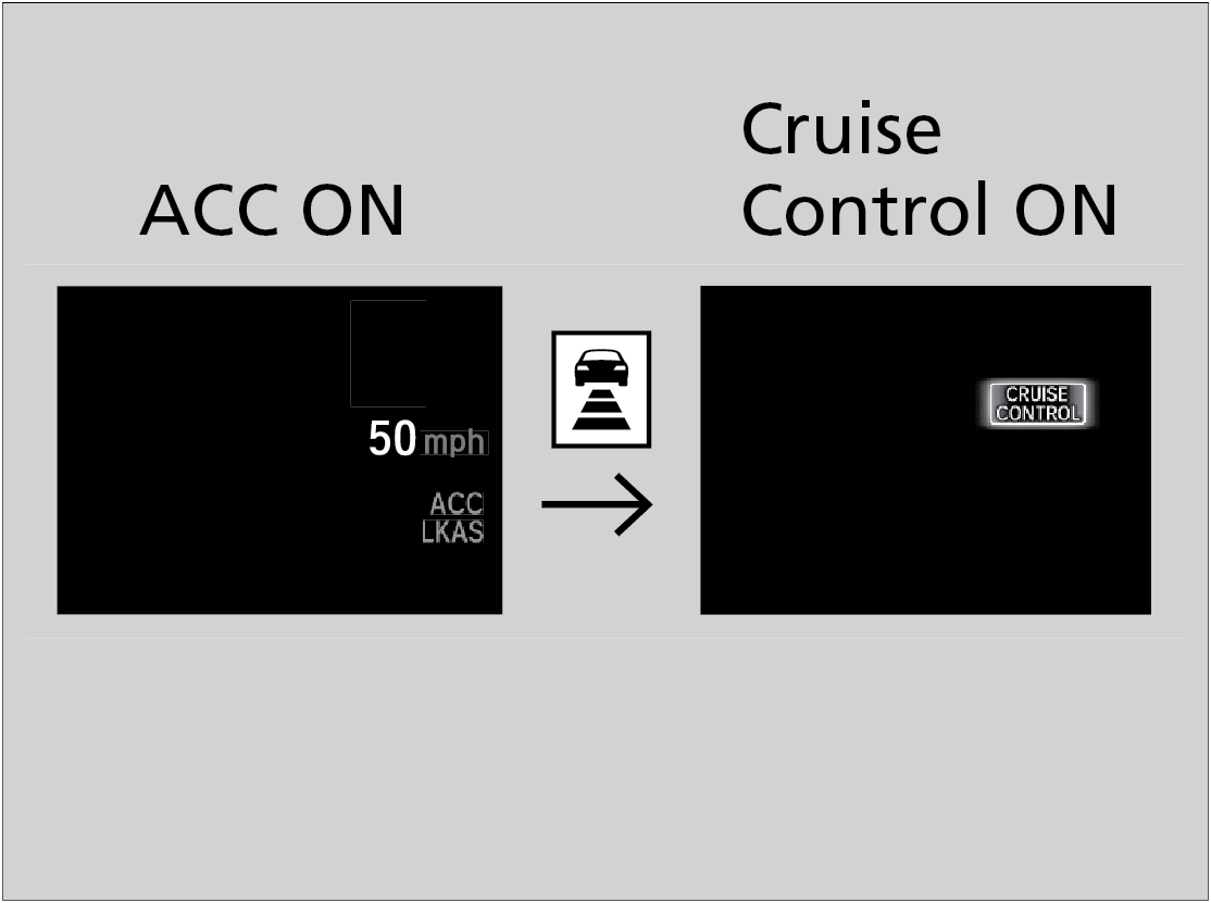 for two seconds, and then the mode switches to Cruise.. Press and hold the interval button again to switch back to ACC