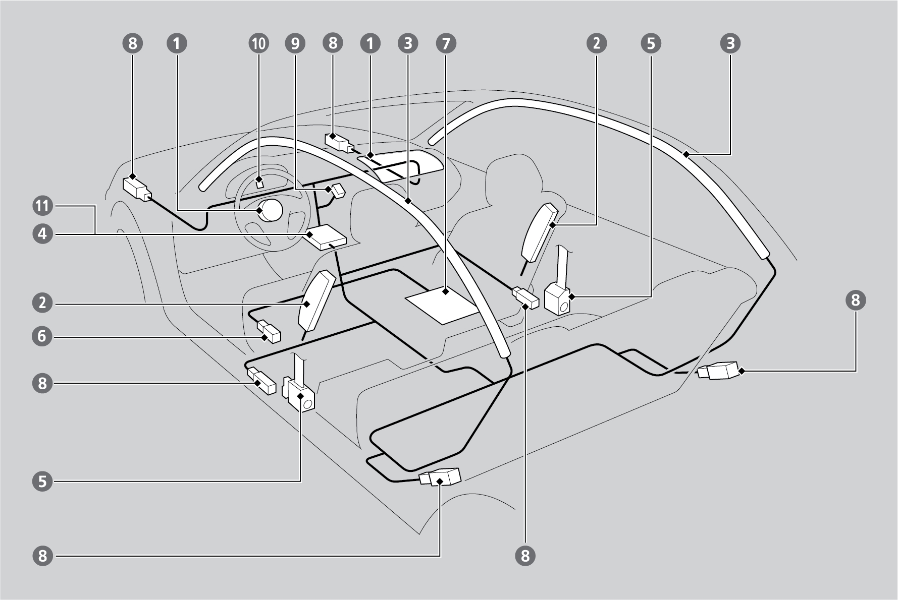 Two side curtain airbags, one for each side of the vehicle. The airbags are stored in the ceiling, above the side windows. The front and rear pillars are marked SIDE CURTAIN AIRBAG.