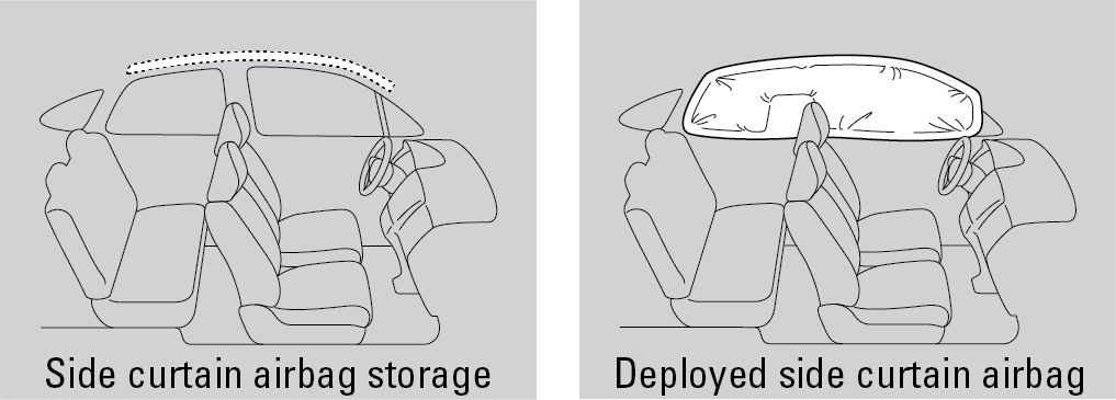 The side curtain airbags are deigned to deploy in a rollover or moderate-to-severe side impact. If the SRS control unit senses that your vehicles is about to roll over, it immediately deploys both side curtain airbags and activates both front seat belt tensioners. If the impact is on the passenger's side, the passenger's side curtain airbag will inflate even if there are no occupants on that side of the vehicle.