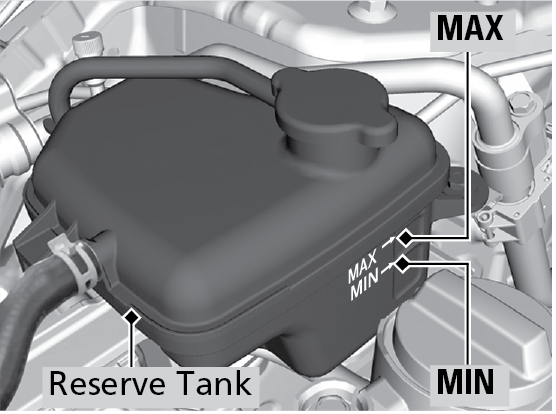 - Once the engine has cooled down, inspect the coolant level and check the cooling system components for leaks. If the coolant level in the reserve tank is low, add coolant until it reaches the MAX mark. If there is no coolant in the reserve tank, make sure the radiator is cool, then cover the radiator cap with a heavy cloth and open the cap. If necessary, add coolant up to the base of the filler neck, and put the cap back on.
