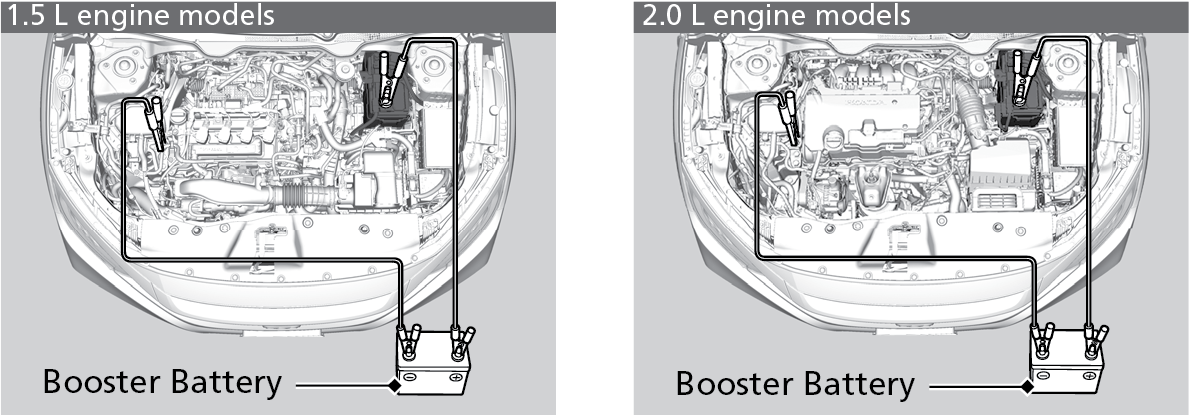 - Connect the other end of the first jumper cable to the booster battery (+) terminal. Use a 12-volt booster battery only.
