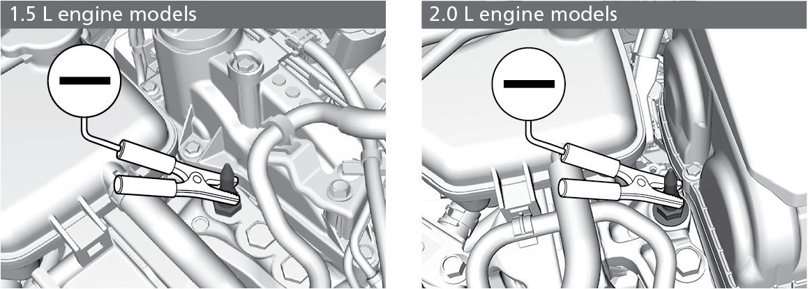 - Connect the other end of the second jumper cable to the engine hanger as shown. Do not connect this jumper cable to any other part.