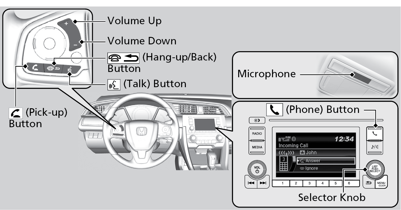 | Pick-up button: | Press to go directly to the phone menu on the driver information interface, or to answer an incoming call. |