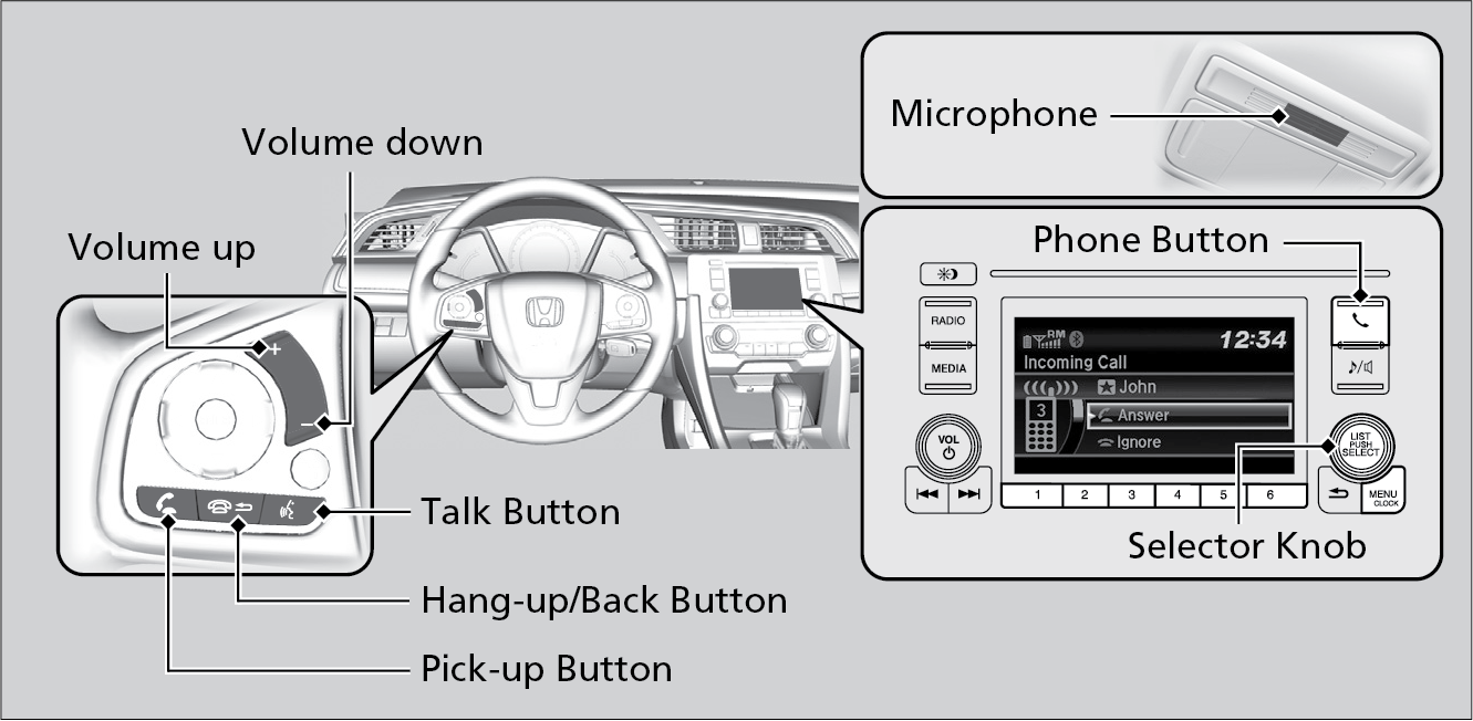 | Pick-up button: | Press to go directly to the phone menu on the driver information interface, or to answer an incoming call. |