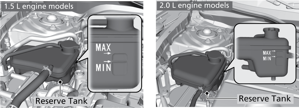 - Once the engine has cooled down, inspect the coolant level and check the cooling system components for leaks. If the coolant level in the reserve tank is low, add coolant until it reaches the MAX mark. If there is no coolant in the reserve tank, make sure the radiator is cool, then cover the radiator cap with a heavy cloth and open the cap. If necessary, add coolant up to the base of the filler neck, and put the cap back on.