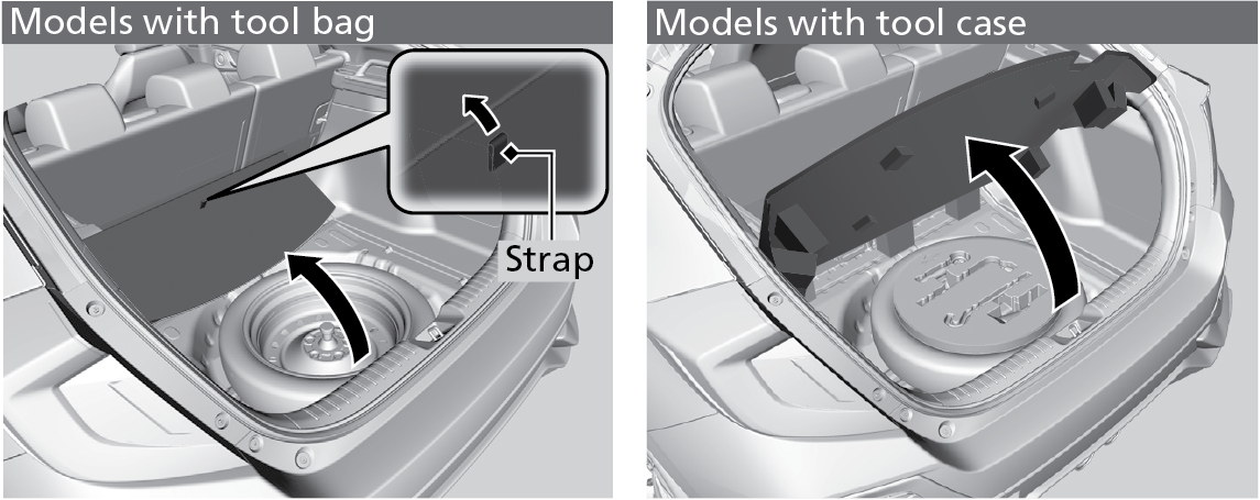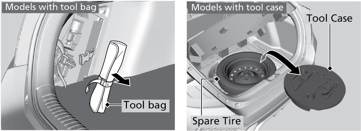 case or bag out. Take the jack handle bar and wheel nut wrench out of the tool