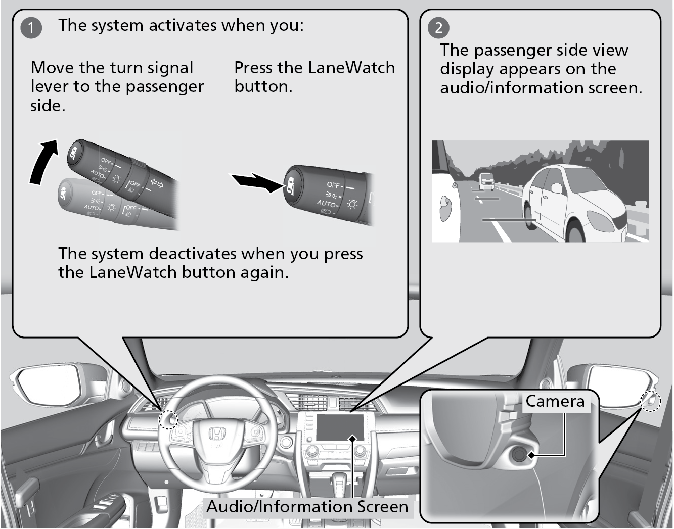 Allows you to check the passenger side rear areas displayed on the audio/information screen when the turn signal is activated to the passenger’s side.