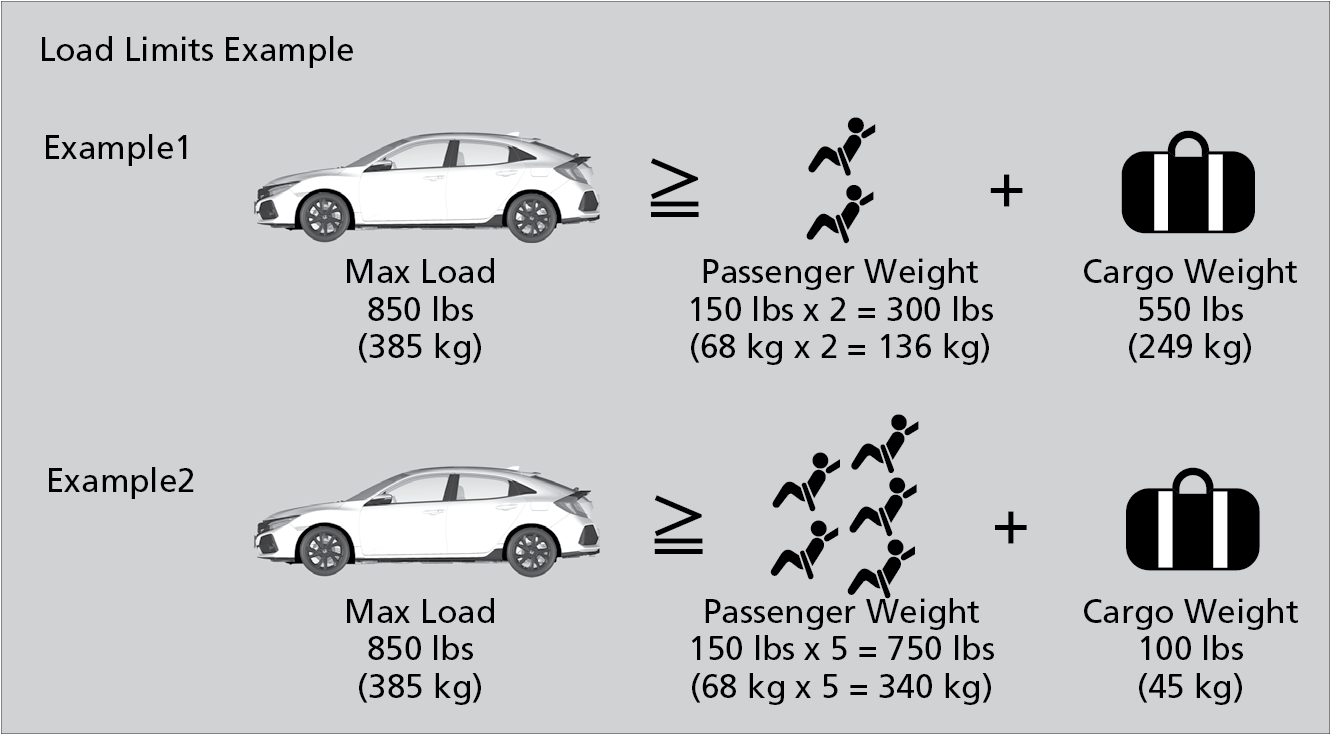 - The resulting figure equals the available amount of cargo and luggage load capacity. For example, if the “XXX” amount equals 1,400 lbs. (635 kg) and there will be five 150 lbs. passengers in your vehicle, the amount of available cargo and luggage load capacity is 650 lbs. (1,400 - 750 (5 x 150) = 650 lbs.).