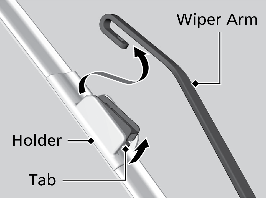 - Press and hold the tab, then slide the holder off the wiper arm.