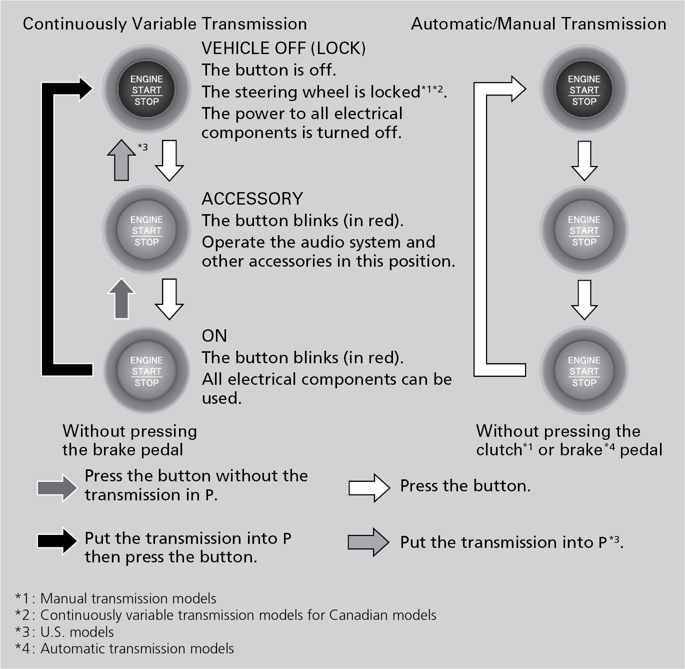 button once without pressing the brake pedal for Accessory mode. Press it again for On mode.