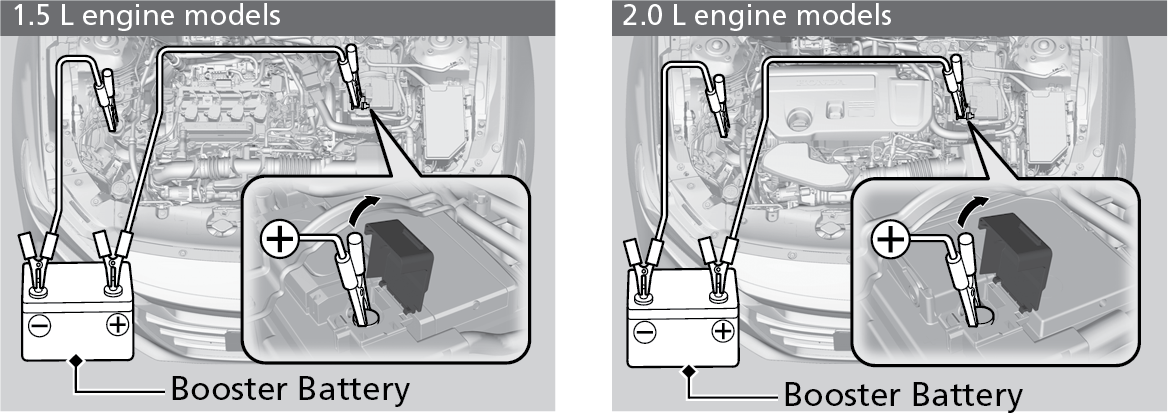- Connect the other end of the first jumper cable to the booster battery (+) terminal. Use a 12-volt booster battery only.
