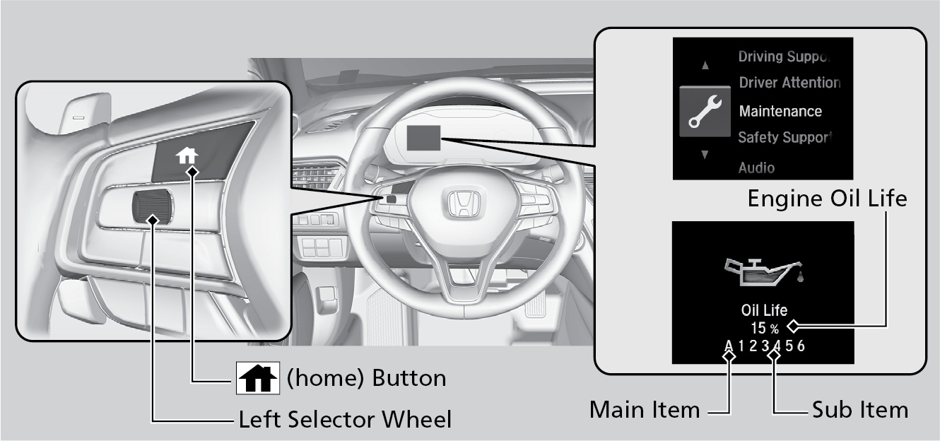 4. Press the left selector wheel to go to the Maintenance Minder screen. The engine oil life appears on the driver information interface along with maintenance items due soon.