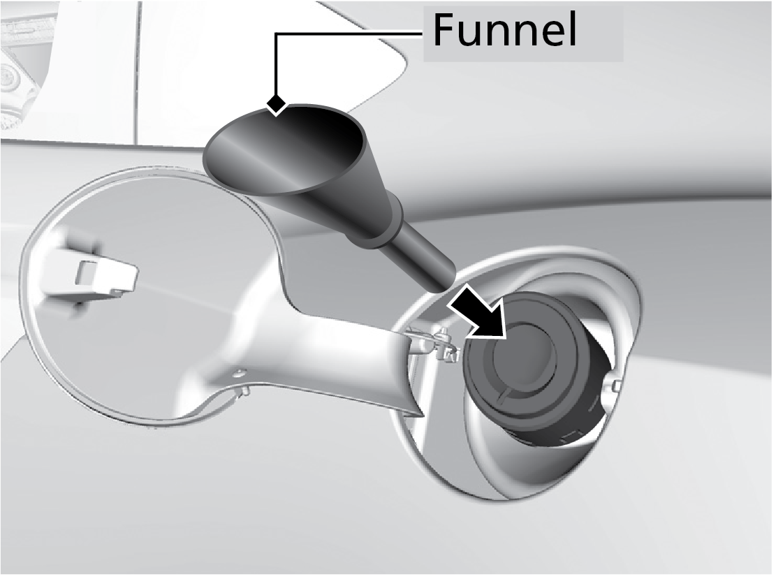 Notice Do not insert the nozzle of a portable fuel container or any funnel other than the one provided with your vehicle. Doing so can damage the fuel system. Do not try to pry open or push open the sealed fuel tank with foreign objects. This can damage the fuel system and its seal.