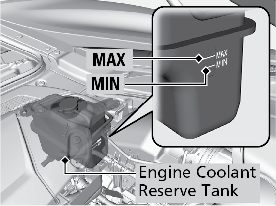 - Once the engine has cooled down, inspect the coolant level and check the cooling system components for leaks. If the coolant level in the reserve tank is low, add coolant until it reaches the MAX mark. If there is no coolant in the reserve tank, make sure the radiator is cool, then cover the radiator cap with a heavy cloth and open the cap. If necessary, add coolant up to the base of the filler neck, and put the cap back on.