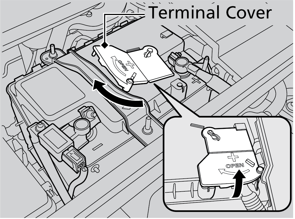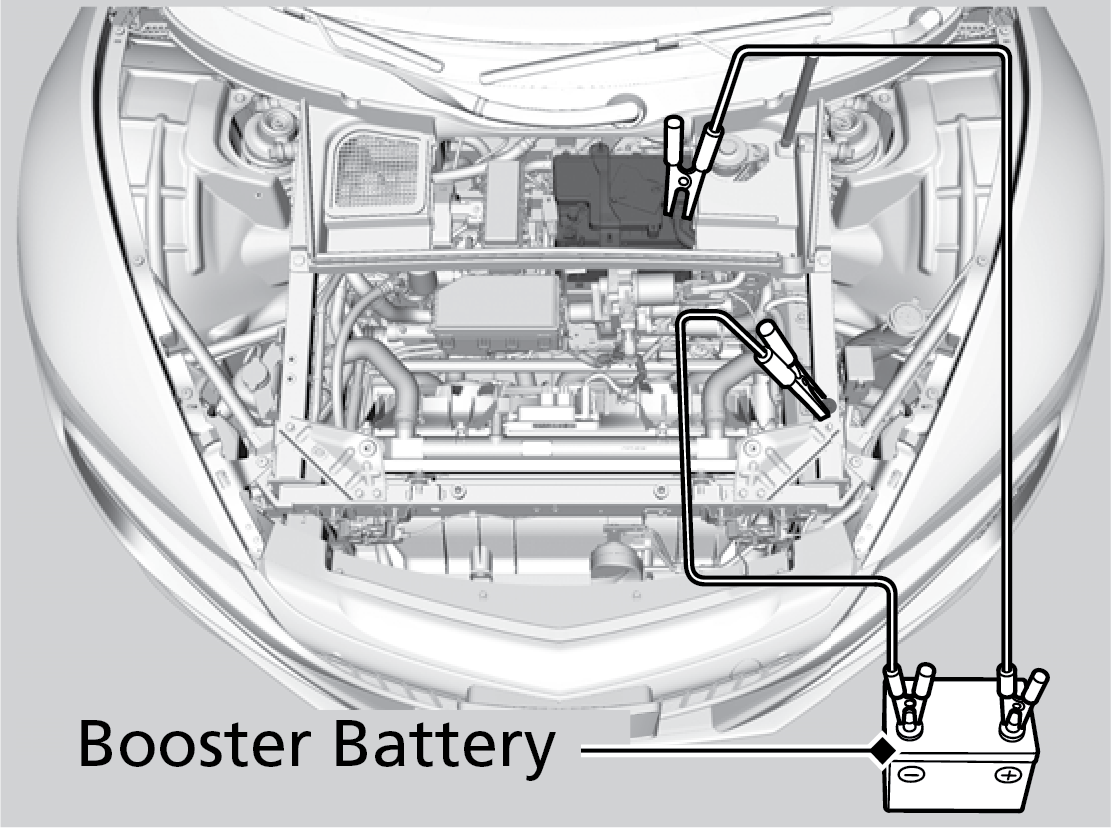 - Connect the other end of the first jumper cable to the booster battery (+) terminal. Use a 12-volt booster battery only.