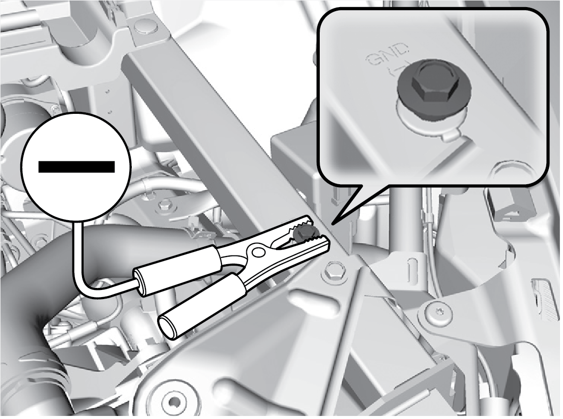 - Connect the other end of the second jumper cable to the engine hanger as shown. Do not connect this jumper cable to any other part.
