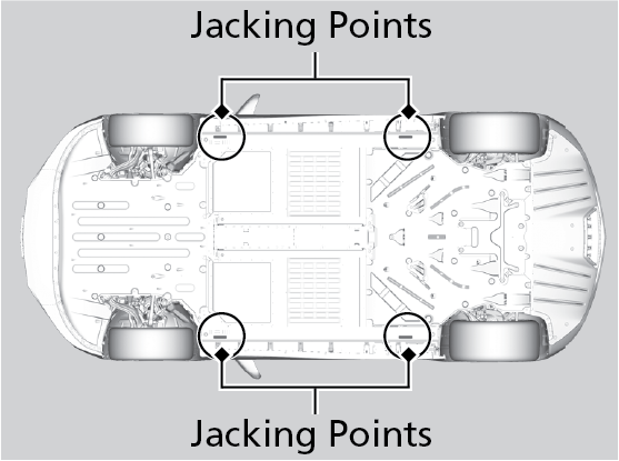 Your vehicle has jacking points as shown. When replacing your tires, consult an authorized Acura NSX dealer.