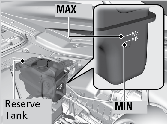- If the coolant level is below the MIN mark, add the specified coolant until it reaches the MAX mark.
