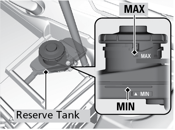The fluid level should be between the MIN and MAX marks on the side of the tank. We recommend using Acura Heavy Duty Brake Fluid DOT 4.