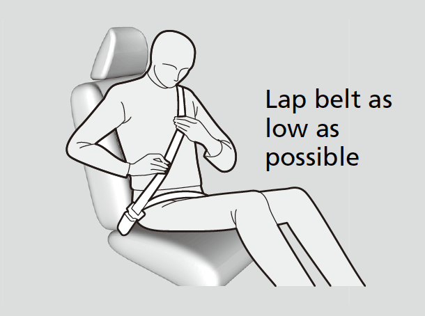 - Position the lap part of the belt as low as possible across your hips, then pull up on the shoulder part of the belt so the lap part fits snugly. This lets your strong pelvic bones take the force of a crash and reduces the chance of internal injuries.