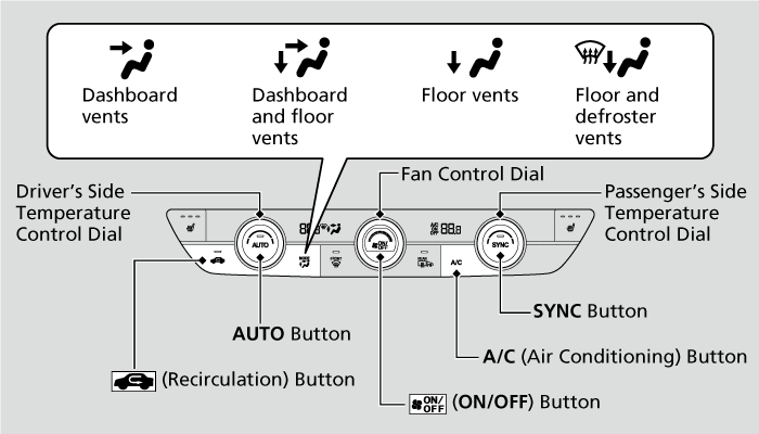 button switches the climate control system between on and off. When turned on, the system returns to your last selection.While ECON mode is active, the climate control system may have reduced cooling performance.