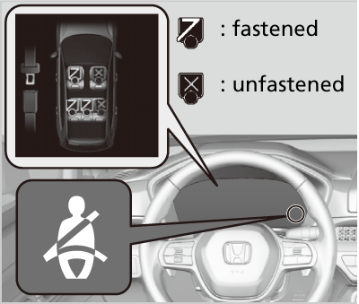 - An unfastened red graphic indicates the seat belt is unfastened and an occupant has been detected.