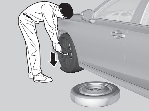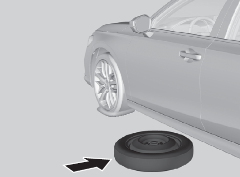- Place the compact spare tire (wheel side up) under the vehicle body, near the tire that needs to be replaced.