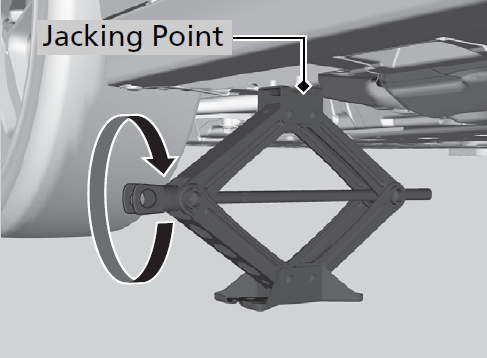 - Raise the vehicle, using the jack handle bar and the jack handle, until the tire is off the ground.
