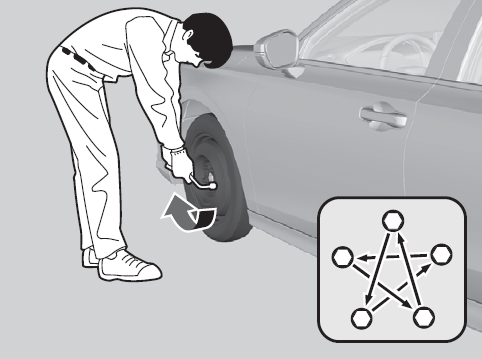 - Lower the vehicle and remove the jack. Tighten the wheel nuts in the order indicated in the image. Go around, tightening the nuts, two to three times in this order.Wheel nut torque:80 lbf∙ft (108 N∙m, 11 kgf∙m)