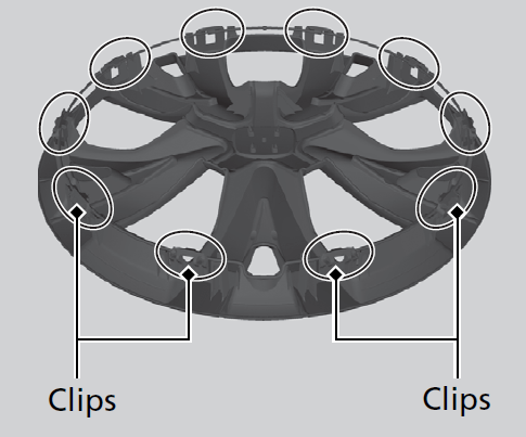 Do not over tighten the wheel nuts by applying extra torque using your foot or a pipe.Models with wheel coverMake sure the wire support ring is hooked into the clips around the edge of the wheel cover.