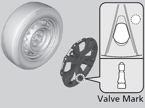 Align the valve mark on the wheel cover to the tire valve on the wheel, then install the wheel cover.
