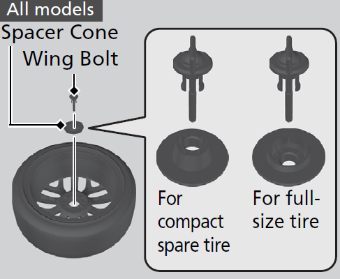 - Unscrew the wing bolt, and remove the spacer cone. Then, remove the spare tire.