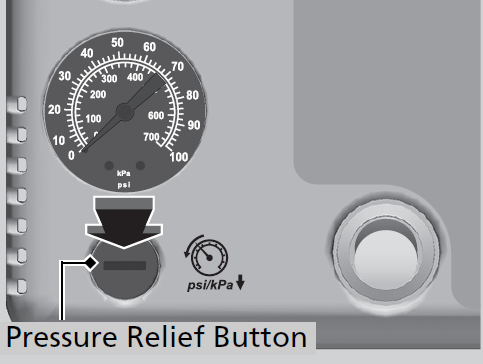 - Press the pressure relief button until the gauge returns to 0 psi (0 kPa).