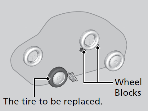- Place a wheel block or rock in front and rear of the wheel diagonal to the flat tire.