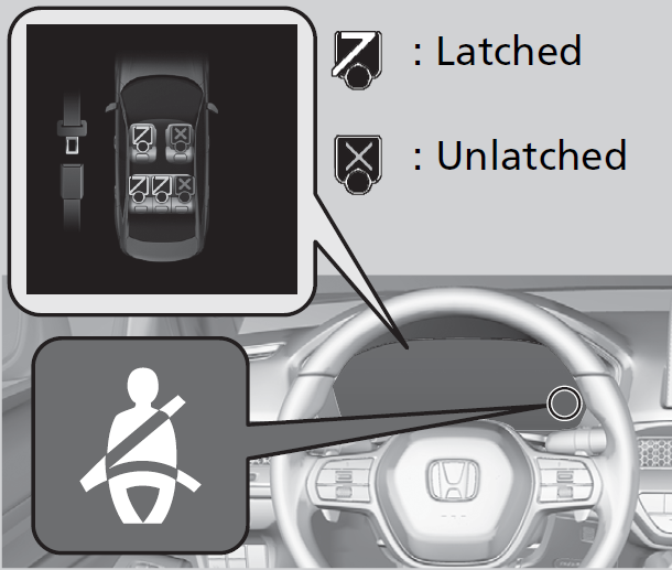 - An unfastened red graphic indicates the seat belt was unfastened recently.