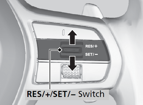 Press the RES/+/SET/− switch up to set or resume the ACC with Low Speed Follow*/ACC* or increase the vehicle speed.