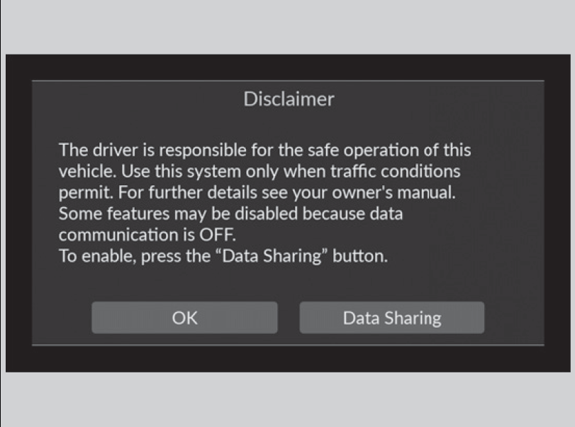 The 9-in. Color Touchscreen starts automatically when you set the power mode to ACCESSORY or ON. At start-up, the following screen about the data upload will be displayed.