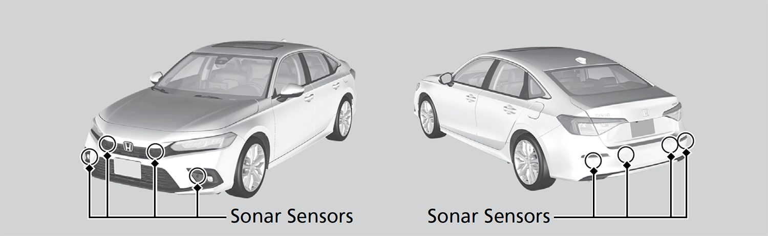 In the following cases, the sonar sensors may not work properly. Have your vehicle checked by a dealer.- The front or rear bumper has made contact with a hill, parking block, curb, embankment, etc.