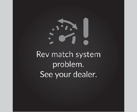 If you depress the accelerator pedal while changing gears, the system may give priority to inputs from the accelerator pedal depending on the amount of depression of the accelerator pedal.If the message below appears, there may be a problem with the system. The rev match system may not operate, but you can perform regular gear shifting.